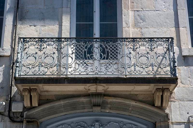 Logis principal : détail du balcon situé au-dessus du portail d'entrée.