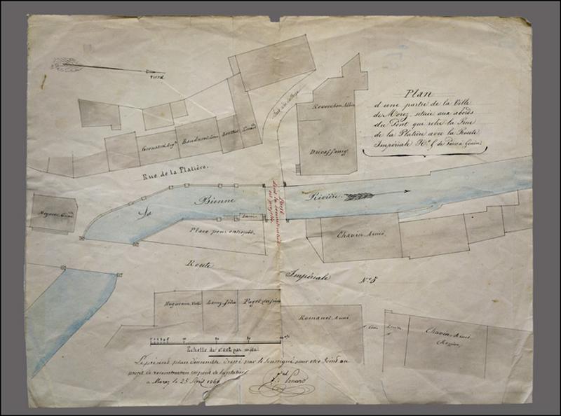 Plan d'une partie de la ville de Morez située aux abords du pont qui relie la rue de la Platière avec la route impériale n° 5 de Paris à Genève, 1860.