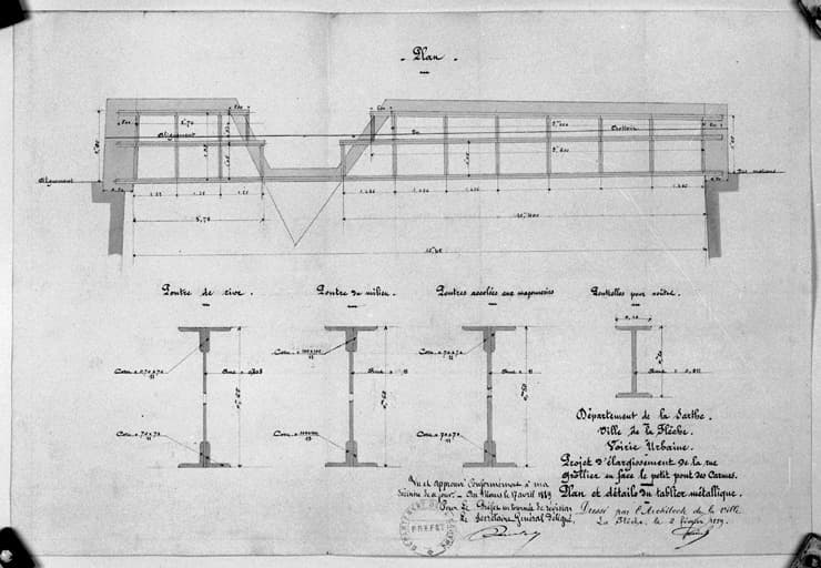 'Projet d'élargissement de la rue Grollier en face le petit pont des Carmes. Plan et détails du tablier métallique', lavis, par Edouard Sevin, 1889