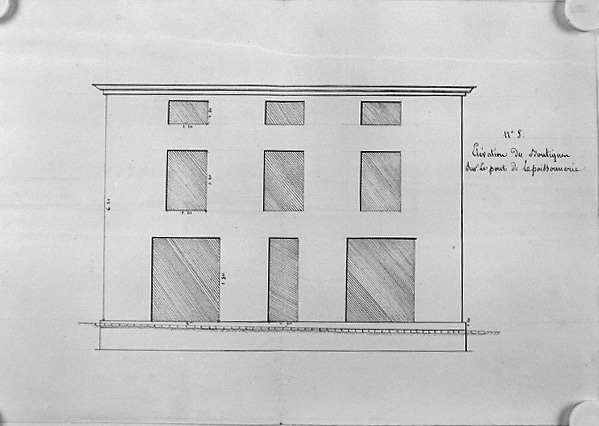 Maisons et boutiques aujourd'hui détruites, autrefois situées à l'angle des actuelles rue des Orfèvres et de la Rochefoucauld : élévation au 1/40e, sur l'actuelle rue de la Rochefoucauld, de la façade projetée, n.s., n.d. [vers 1810-1820].