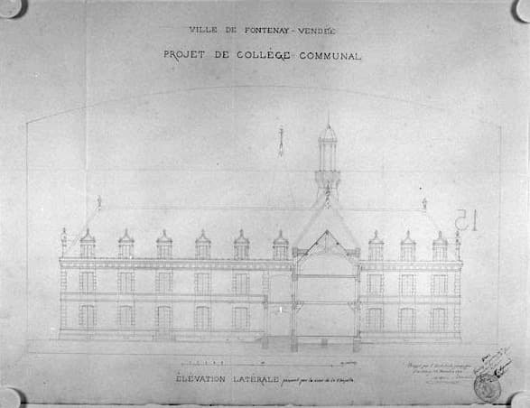 Projet initial. 'Elévation latérale passant par la cour de la chapelle', au 1/100e signée et datée Arsène Charier, le 22 décembre 1871. (A.C. Fontenay-le-Comte, 4 M 1).