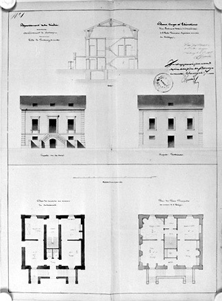 'Plans, coupe et élévations d'un bâtiment destiné à l'aumonier à l'école primaire annexée au collège'. Document au 1/100e signé et daté A. Garnereau, le 8 novembre 1845.