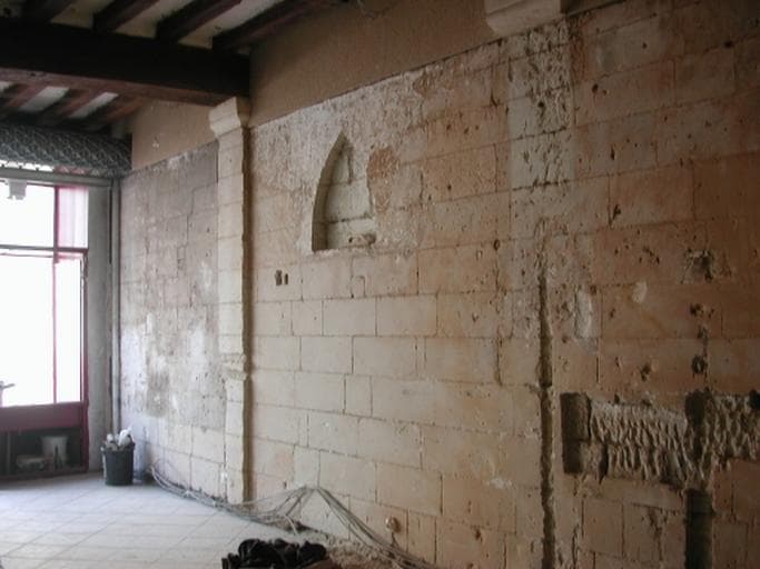 Rez-de-chaussée, boutique : élévation intérieure gauche (est) appareillée en tuffeau, vue en axe sud-nord. Dégagement pendant les travaux de juin-juillet 2001.