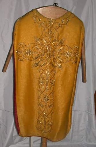 chasuble ; bourse de corporal ; étole ; manipule ; voile de calice
