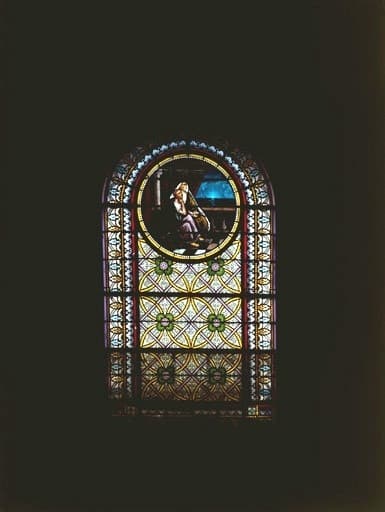 POP | Plateforme ouverte du patrimoine4 verrières mixtes : Saint Eutope et Sainte Eustelle ; Sainte Famille ; Jésus bénissant les enfants ; Saint Augustin et Sainte Monique ; 1 verrière figurée : Sacré Coeur entouré de huit saintes