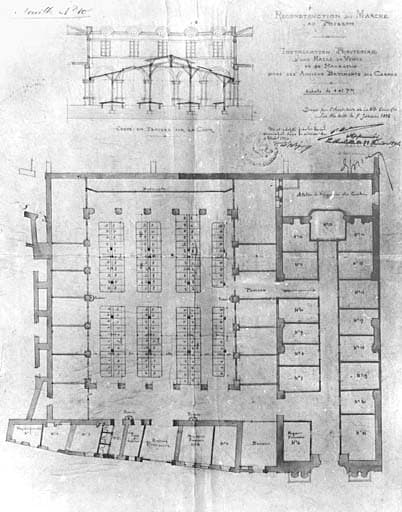 Marché au poisson, reconstruction, plan et coupe sur la cour. 1896. Corbineau.