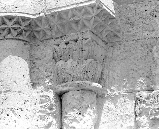 Façade, portail, arcature aveugle de droite, détail, chapiteau de gauche.