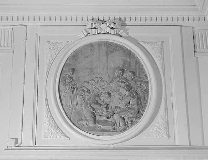 Corps principal, rez-de-chaussée, vestibule, dessus de porte sud-ouest, médaillon stuqué (scène du Lavement des pieds).
