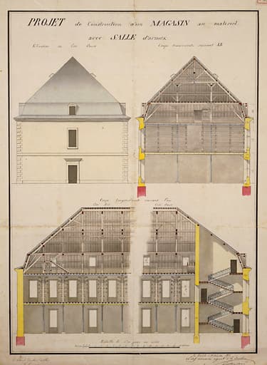 Projet de construction d'un magasin avec salle d'armes, élévation et coupes. 20 décembre 1871, par Hernnet.