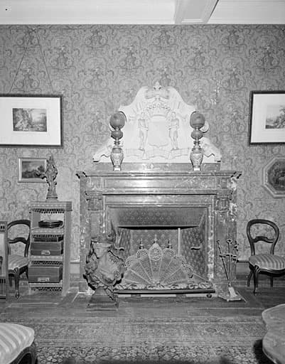 Logis, salon à l'entresol : cheminée avec les armes et la devise du comte de Menou ('Magna sustinentur magnis').