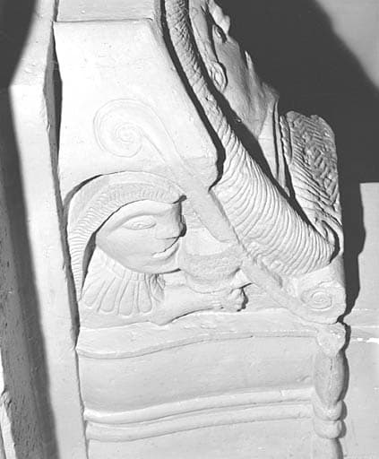 Logis, rez-de-chaussée, pièce centrale du flanc nord-ouest, cheminée, détail du corbeau de gauche, face latérale gauche : tête d'homme.