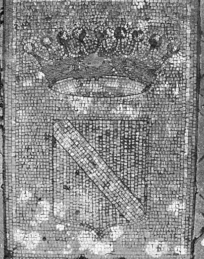 Seuil devant la façade nord-ouest du château : mosaïque représentant les armoiries des de Menou.
