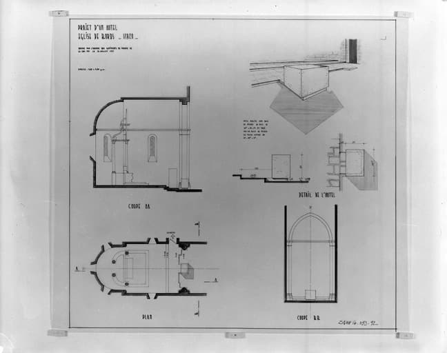 Projet d'autel. Coupes, plan et élévation, en 1977.