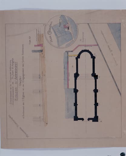 Projet d'isolement de l'église et de dégagement des socles extérieurs. Coupe, plan masse et plan. Sans date.