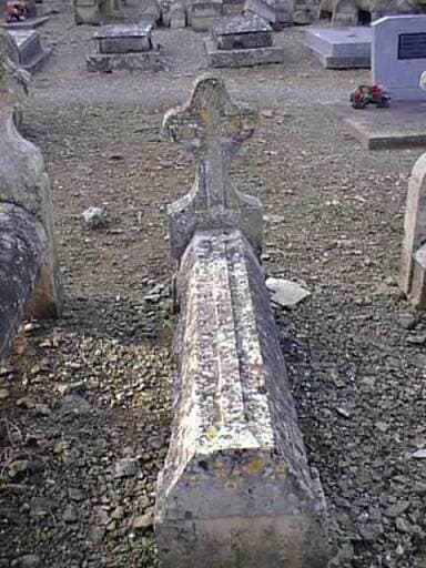 Vue d'un tombeau en bâtière applanie ornée d'une croix très allongée avec stèle ornée d'une croix.