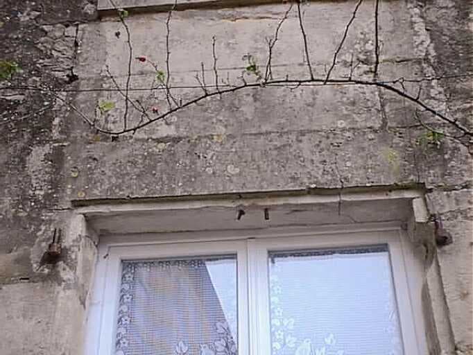 Logis, élévation sud sur cour, rez-de-chaussée, fenêtre de gauche, linteau daté 1613.