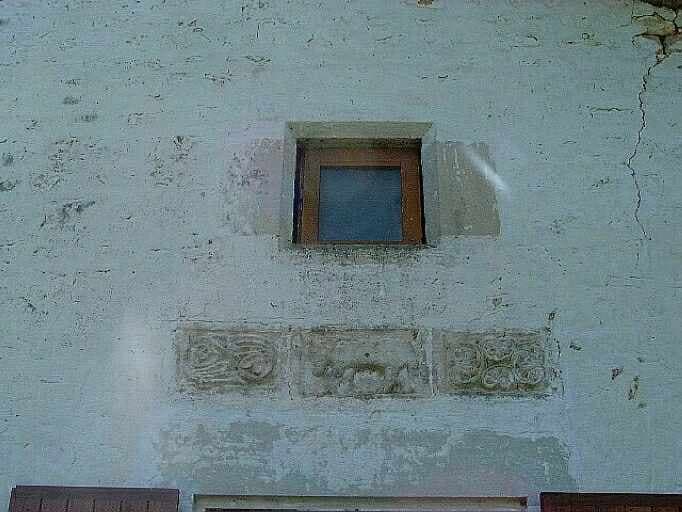 Logis, élévation antérieure, détail de la baie chanfreinée de droite du comble à surcroît à encadrement chanfreiné et du décor sculpté au-dessous.