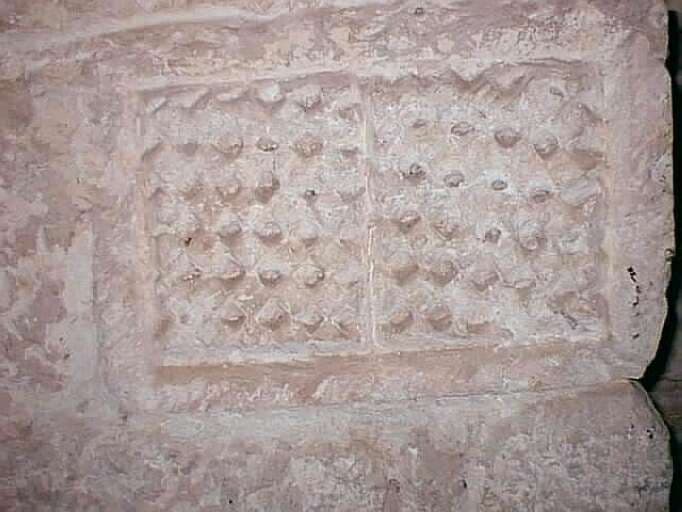 Logis, intérieur, comble à surcroît, piédroits de la porte d'accès à la pièce de droite, détail d'une pierre piquetée.
