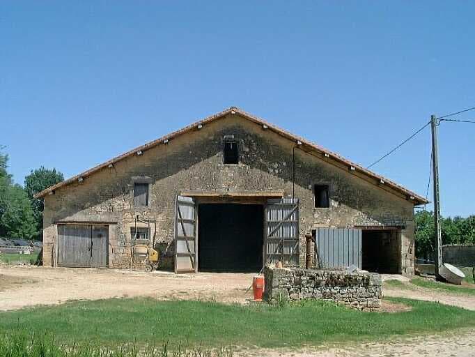 Grange-étable, élévation antérieure, prise du sud-ouest, au premier plan, l'ancien puits et la pompe en fonte.