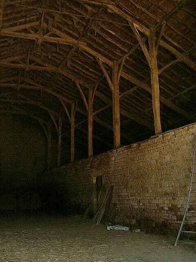 Grange-étable, intérieur, côté latéral de droite, détail des poteaux en bois et de la charpente.