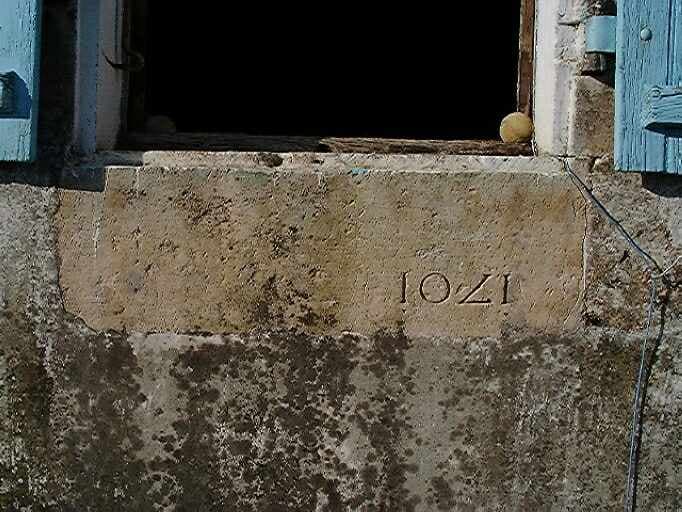 Logis principal, élévation antérieure, travée de droite, détail d'une pierre remployée datée 1701.