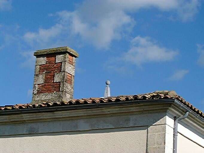 Logis au nord, élévation latérale gauche, détail de la corniche moulurée et de la souche de cheminée pierre et briques.