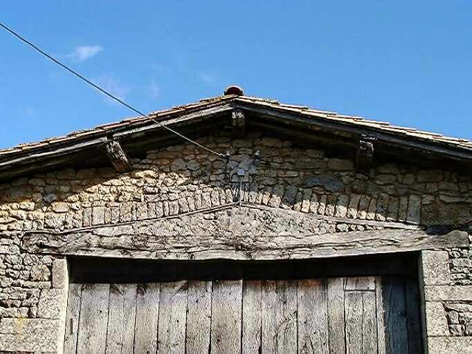 Dépendances agricoles, grange-étable au nord-est de la parcelle 134, élévation antérieure nord-ouest, détail du linteau du portail d'accès surmonté d'un arc de décharge.