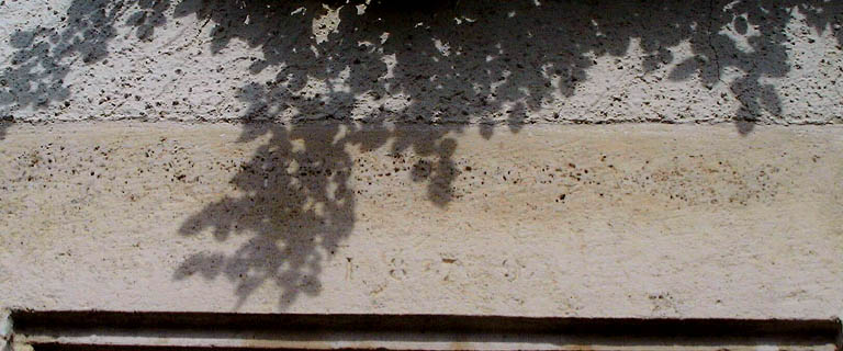 Logis, daté 1879, rez-de-chaussée, baie de gauche (ancienne porte d'entrée), détail du linteau daté.