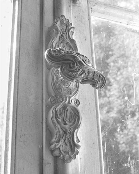 Logis, aile nord, ancienne bibliothèque vue vers le nord, détail d'une crémone de fenêtre