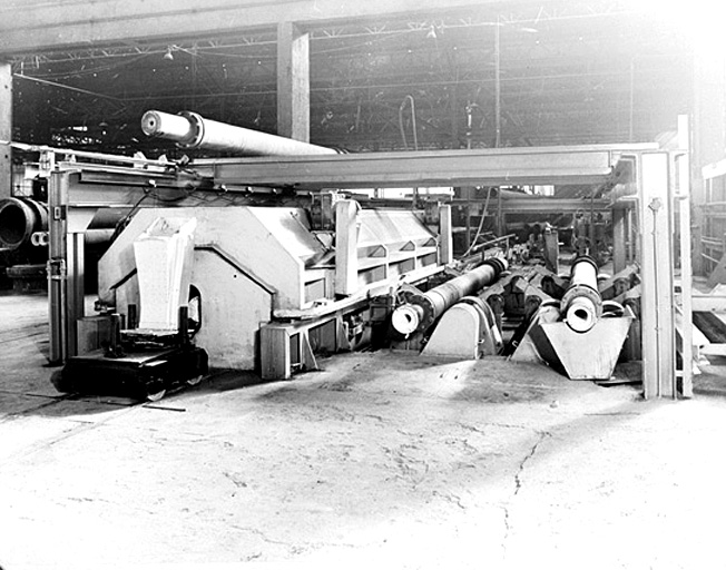 Aciérie : machine, à trois postes, à centrifuger les tuyaux. Photo Ray Delvert, Villeneuve sur Lot (47), 1972. A. Privées.
