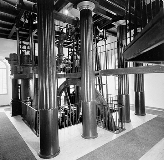 Machine de Watt. Ensemble, niveau 0 : au centre, volant d'inertie. Photo Ray Delvert, Villeneuve sur Lot (47), 1988. A. Privées.