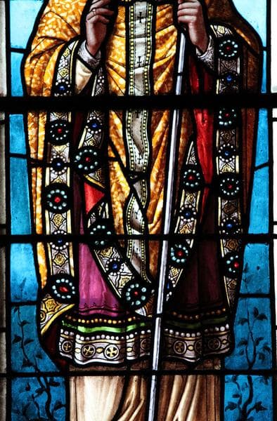 ensemble de 10 verrières : Saint Sébastien, Saint Fabien, Saint Pierre, Immaculée Conception, symboles (baies 1 à 10)