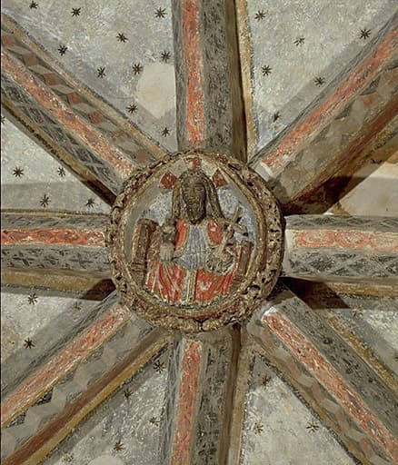 Clé de voûte centrale de la chapelle du XVe siècle : Christ enseignant.
