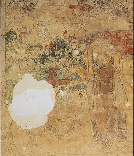 Chapelle XVe s. Mur oriental ; panneau supérieur droit : La Nativité.