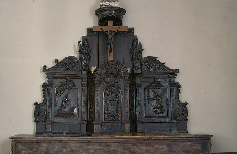 POP | Plateforme ouverte du patrimoinecroix d'autel et tabernacle architecturé à ailes et dais d'exposition de l'autel de la Vierge : Annonciation, et ses 2 statuettes : Anges lampadophores