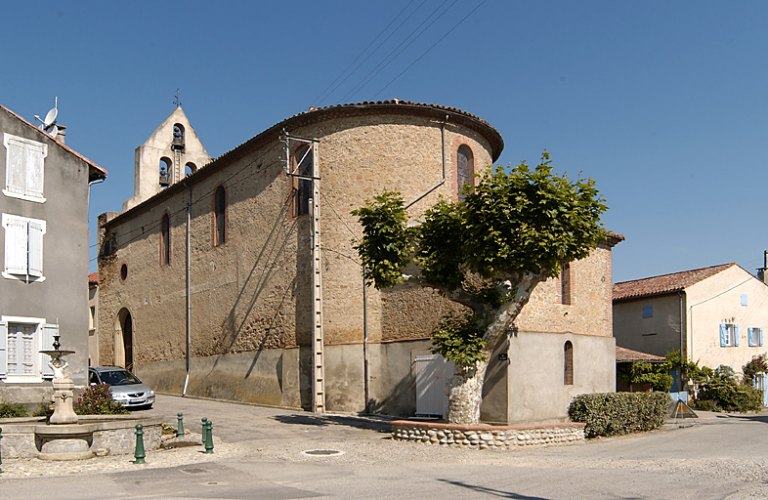 Vue d'ensemble de l'église depuis la place : élévation sud de la nef et chevet avec la sacristie attenante derrière celui-ci.