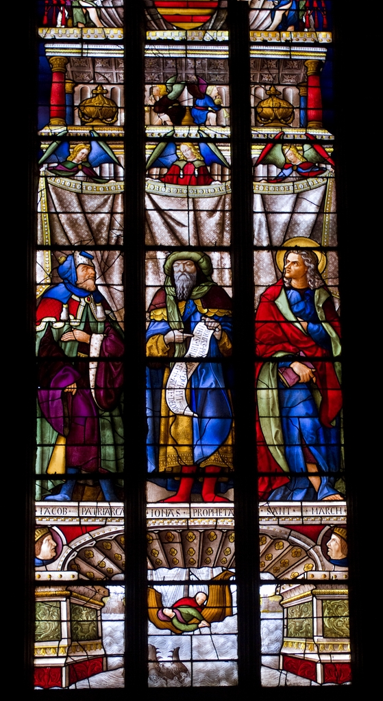 Partie médiane du vitrail: Jacob, Jonas, Saint-Marc.