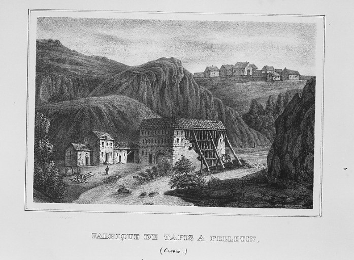 Une vue romantique du moulin Mirabeau dans les années 1830, à droite les ateliers partiellement ruinés, à gauche la maison de gardien. Gravure donnée par J.-B. Tripon sous l'intitulé : Fabrique de tapis à Felletin, celle de M. Sallandrouze.