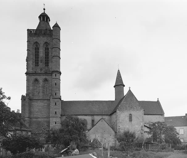 Elévation d'ensemble sud prise avant la restauration de l'église et montrant une maison accolée au transept sud et aujourd'hui démolie.