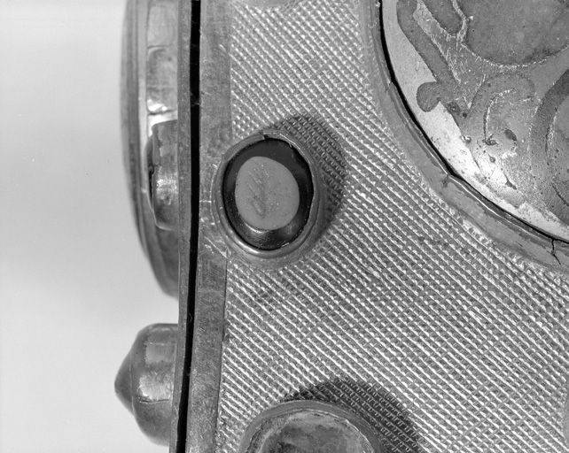 Détail d'une intaille représentant un rameau, sur le pignon gauche, à droite, 3e cabochon en partant du bas.