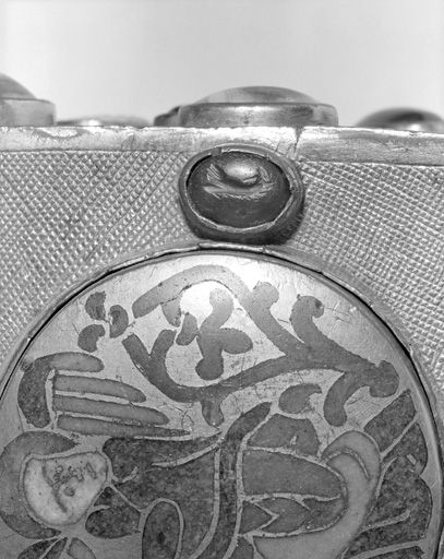 Détail d'une intaille sur le rampant du toit du flanc majeur, à droite.