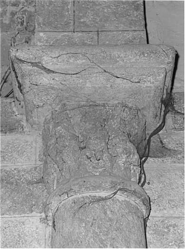 Chapiteau sculpté soutenant l'arc triomphal (côté nord) : personnage entre deux lions (symbole de la force de la foi ou Daniel dans la fosse aux lions ?).