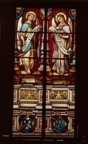 Détail de la partie centrale de la lancette de gauche : ange portant le phylactère 'Salus infirmorum', et de la lancette de droite : ange portant le phylactère 'Consolatrix afflictorum'.