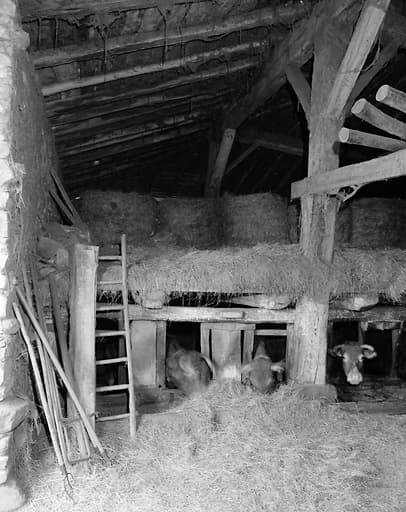 Intérieur de la grange-étable. Vue partielle de la barge gauche et d'un poteau soutenant la charpente.