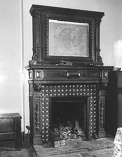 Rez-de-chaussée, aile nord, cuisine : cheminée en bois et céramique, 19e siècle.