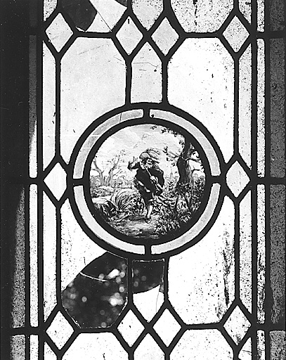 Grenier, ancienne porte entre la cuisine et la salle à manger. Panneau de verrière, déposé, verre peint, 19e siècle.