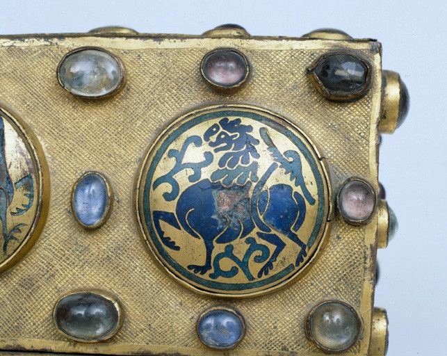 Détail : médaillon émaillé d'un lion, à droite sur le rampant du toit du flanc mineur.
