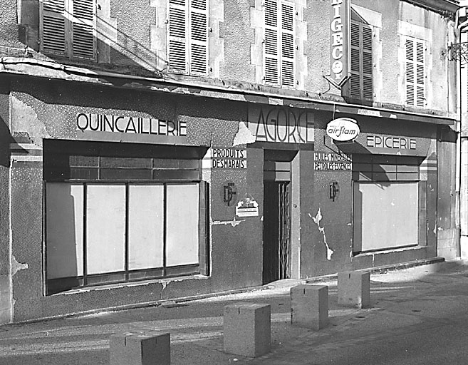 La Souterraine, ville. 3 rue Saint-Jacques. Maison avec rez-de-chaussée à usage commercial. Vue de la devanture de la boutique en mosaïque et datant des années 30-40. Cadastre 1992 BD 146.