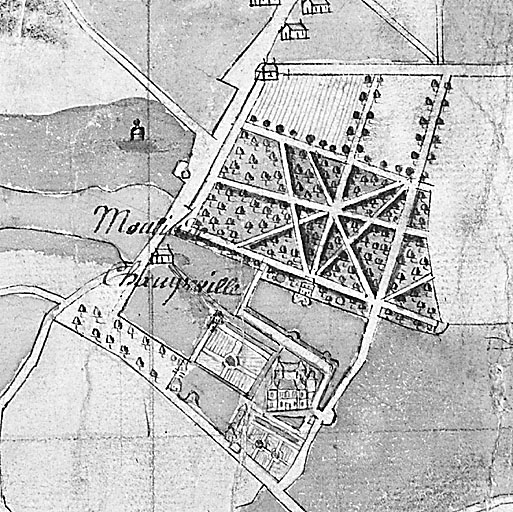 Plan général du marquisat de Saint-Germain-Beaupré, Dun et La Guierche, fait par nous Pierre Nicolas Emmanuel Vincent Dumondi écuyer avocat féodaliste du comté de Poitou, 1787. Détail du château et du parc.