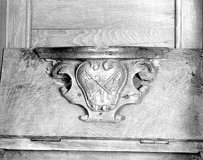Détail de miséricorde d'une stalle basse côté nord : écu aux armes de saint Pierre et de saint Paul (2 clefs croisées sur une épée).